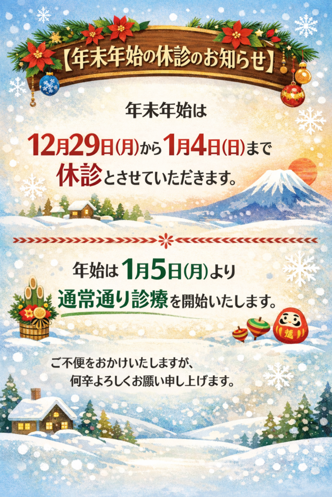 年末は12/29月曜日から1/4まで休診です。